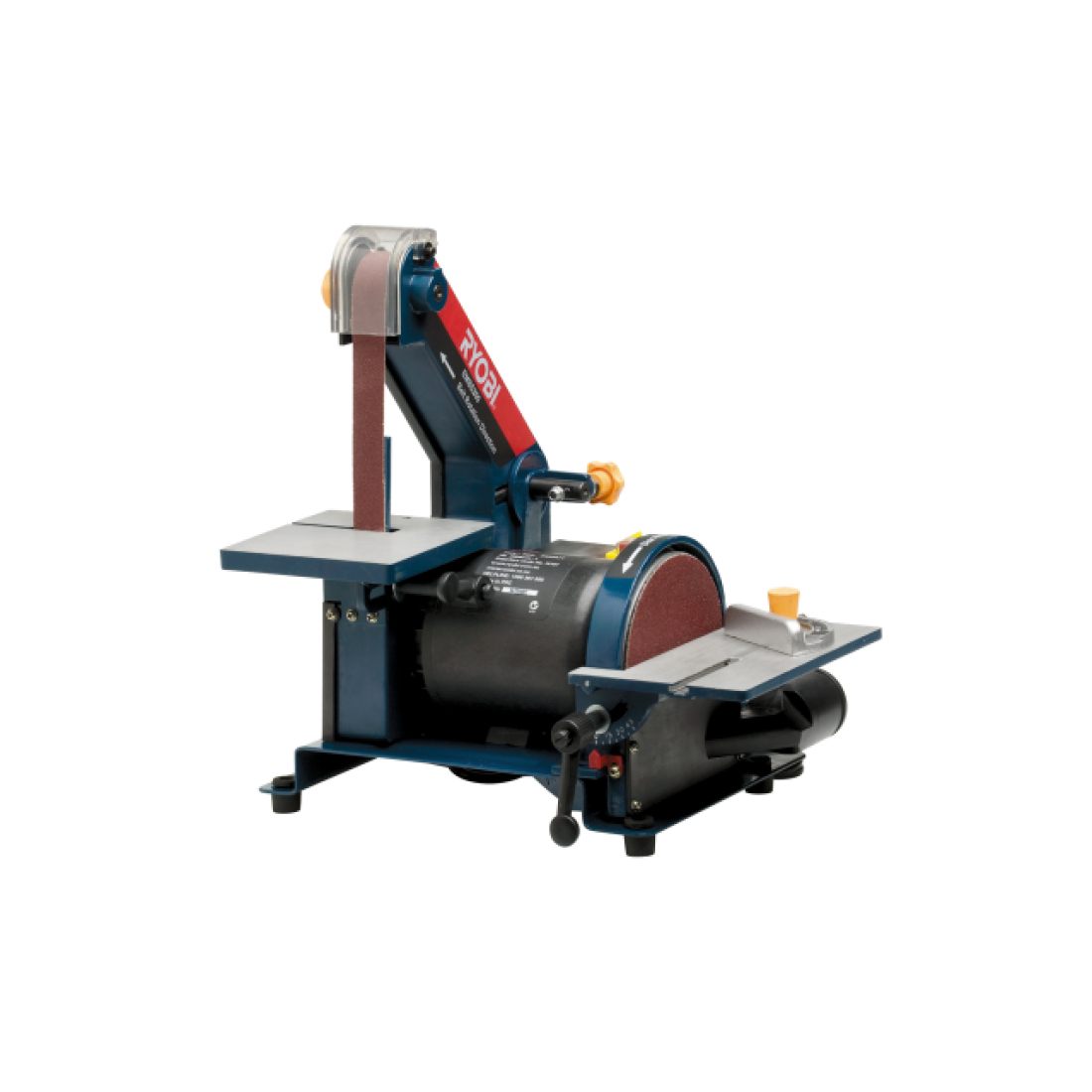 This sander keeps the workspace clean with dust extraction and uses a tracking knob to keep the belt aligned. The tension release knob allows quick belt changes, and the adjustable tables support different sanding angles. The mitre gauge helps set precise sanding positions.