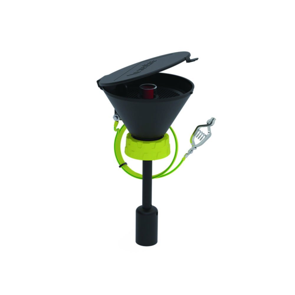 The Bohlender b.safe Funnel 130 S 60 (Ø 130 mm) is crafted from static-dissipative PE‑EX, offering safe and efficient disposal of liquid waste in laboratory environments. Equipped with a hinged lid to minimize vapor escape and a removable sieve to retain solids, this funnel features an integrated level indicator for monitoring fluid levels in opaque containers. Engineered for secure attachment to waste vessels via a freely turnable cap, it also includes a 1.5 m grounding cable for static protection.