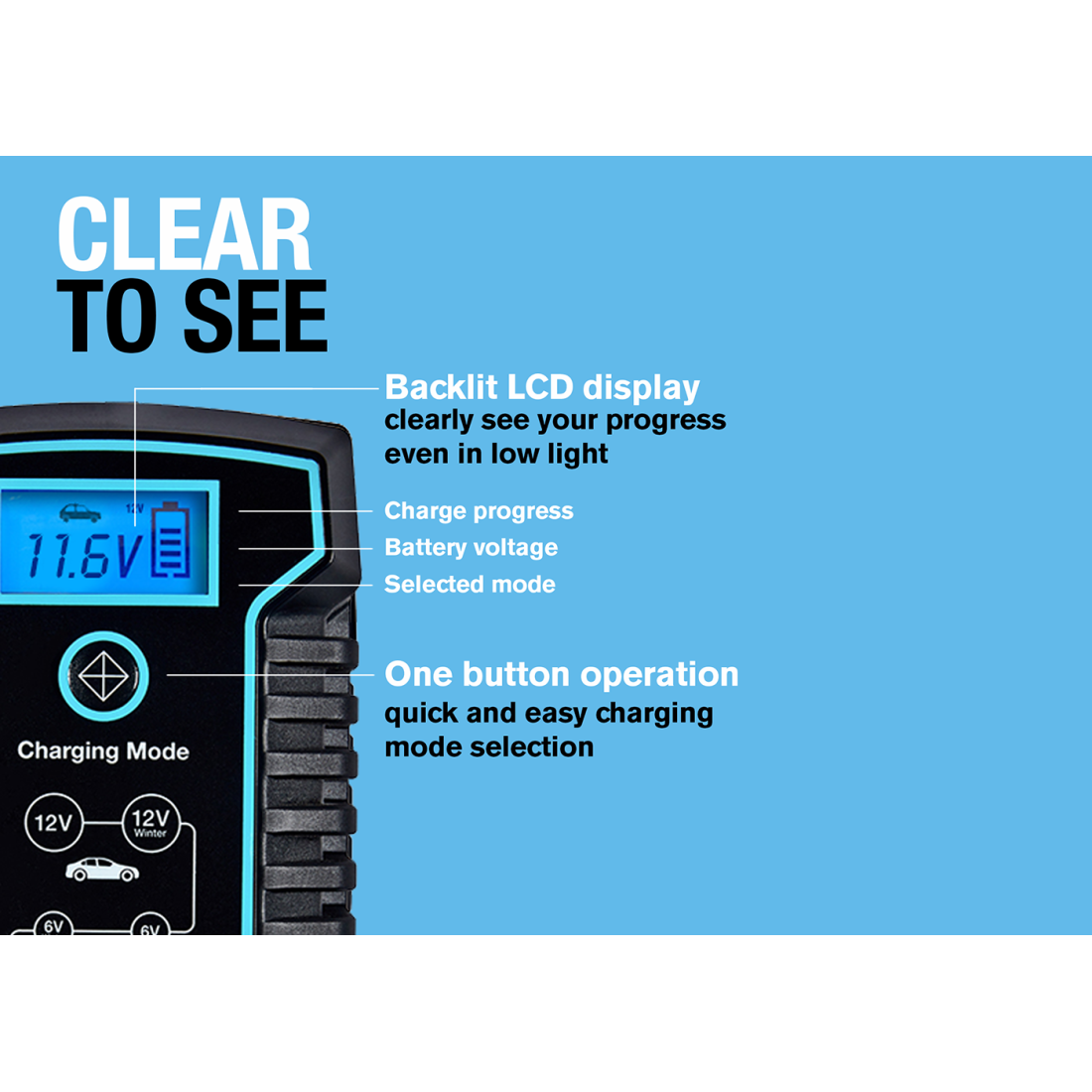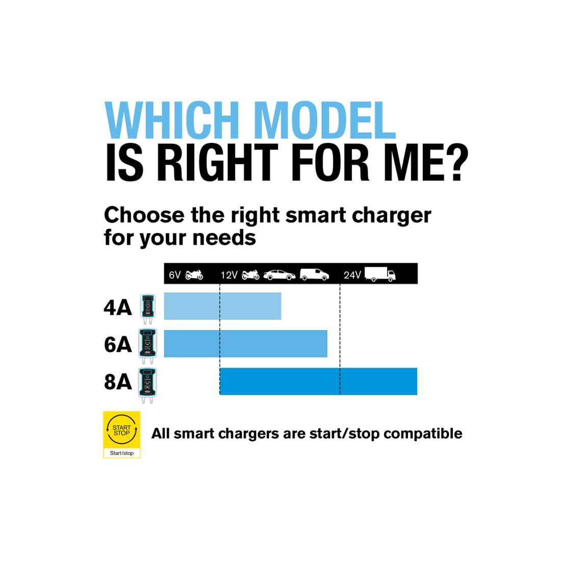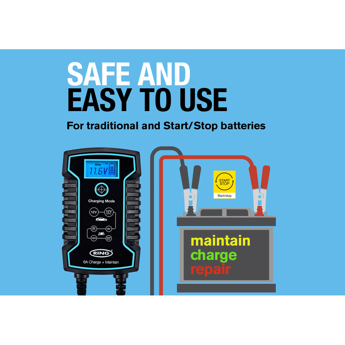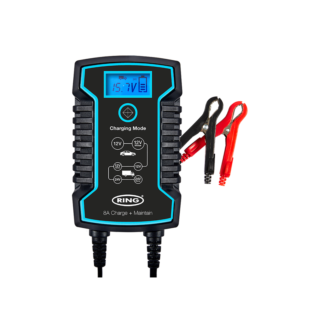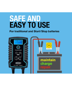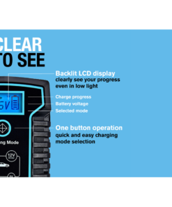 8A smart charger and battery maintainer suitable for 12V and 24V vehicles and recommended for START/STOP batteries. Compatible with lead acid, gel, calcium, EFB and AGM batteries. Keeps batteries in good condition without risk of overcharging. One button operation and large LCD backlit display for ease of use as well as reverse polarity and short-circuit protection for safety. Connect and be sure with the charger adjusting automatically to long-term maintenance mode when the vehicle’s battery is full.Available with three pin plug (part number RSC808) two pin plug (part number RESC808)