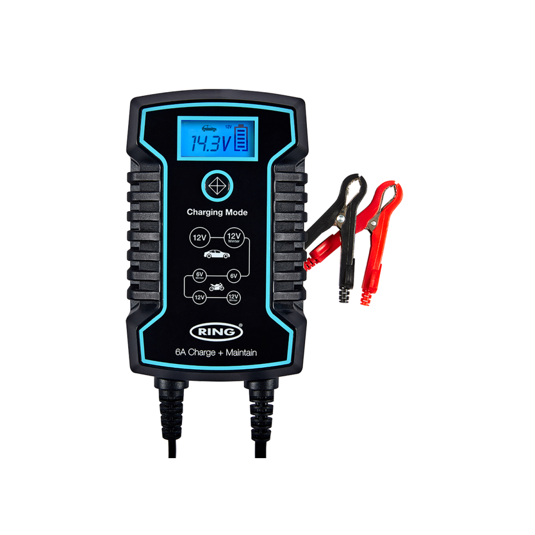 6A smart charger, for both 6V and 12V vehicles. Recommended for START/STOP batteries as well as being compatible with lead, gel, calcium, AGM, and EFB battery types. Keeps batteries in good condition without risk of overcharging. One button operation and large backlit digital display for ease of use as well as reverse polarity and short-circuit protection for safety. Connect and be sure that there won’t be any overcharging as a result of using the smart charger with the charger adjusting automatically to long-term maintenance mode when the vehicle’s battery is full.Available with three pin plug (part number RSC806) and two-pin plug (part number RESC806)