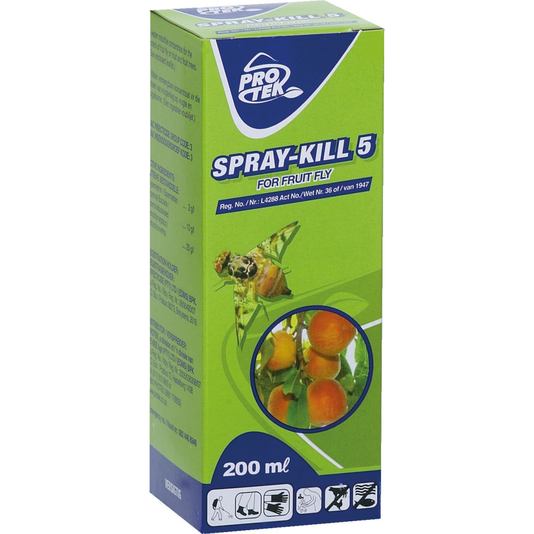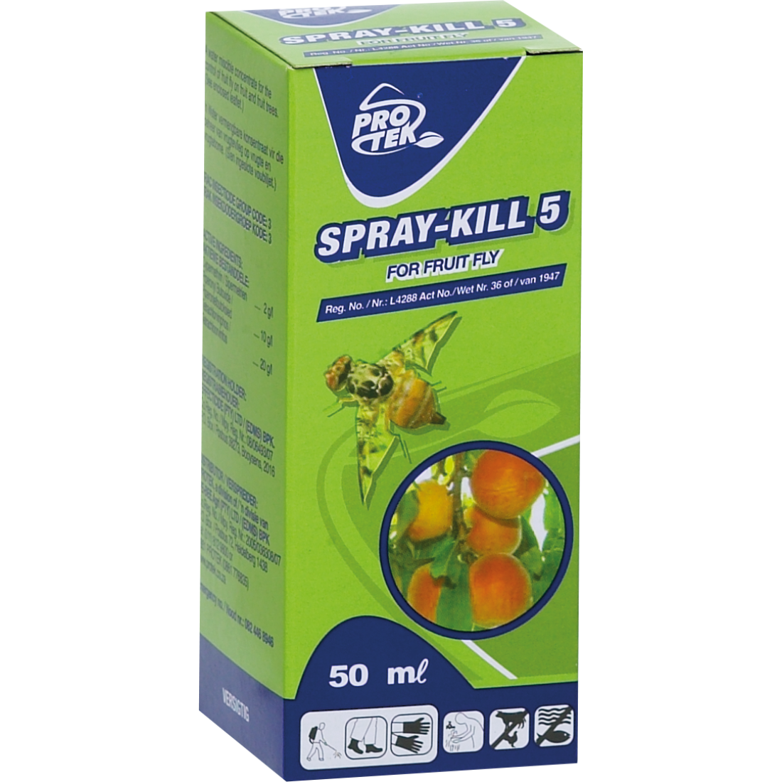 Protek SPRAY-KILL 5 is a powerful water miscible concentrate formulated for the effective control of fruit fly on various fruits and fruit trees. This product contains a three-way combination of active ingredients to ensure high efficacy against the target pest.