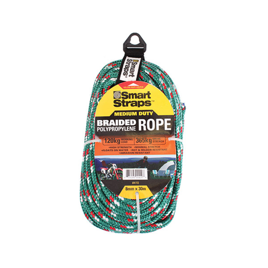 The Braided Polypropylene Rope 8mm 30M Is A Robust And Durable Rope Designed For Heavy Duty Outdoor And Indoor Applications. With A Diameter Of 12mm And A Length Of 15 Meters; This Rope Offers Superior Strength And Reliability For A Wide Range Of Tasks.The Ropes Are Made From Braided Polypropylene. It Has Minimal Stretch; Floats On Water; Is Rot And Mildew Resistant; And Also Abrasion Resistant. The Medium Duty Rope Has A Working Load Of 120Kg And A Break Strength Of 365Kg While The Smartstraps Xtreme Duty Rope Has A Working Load Of 245Kg And A Break Strength Of 745Kg.