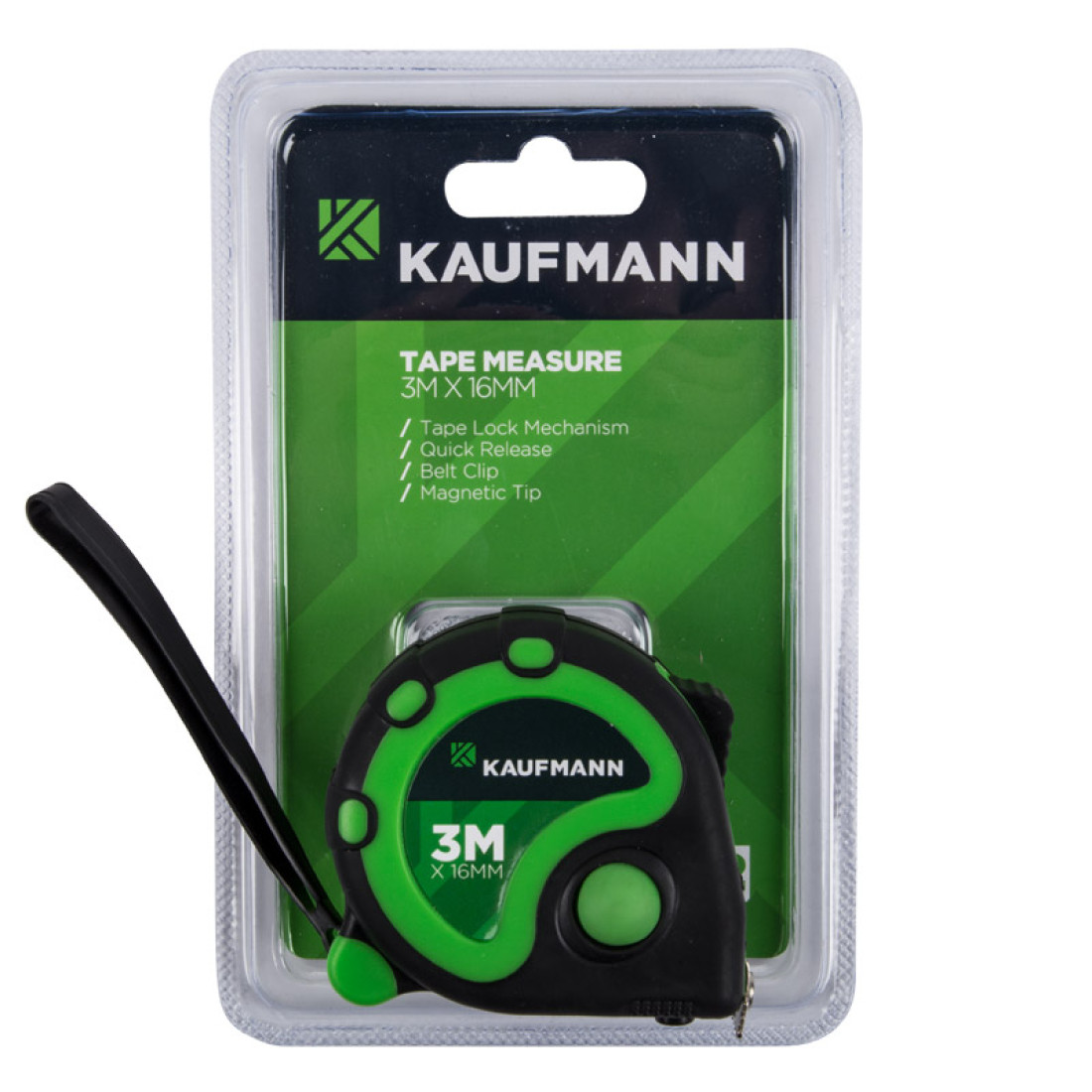 The Kaufmann Tape Measure CR90 3m x 16mm is expertly designed for measuring long lengths with ease and precision. Whether tackling DIY projects, construction tasks, or simple household measurements, this tape measure stands out with its range of features tailored for versatility and convenience.** Key Features:** Flexible Design: The tape’s flexibility allows for easy measuring around angles and curves, ensuring accurate results every time.* Metric Markings: Clearly marked in millimetres (mm) and centimetres (cm), making it suitable for various measuring needs.* Quick Release Function: Effortlessly retract the tape with a quick release mechanism, enhancing efficiency during use.* Durable Construction: Encased in an ABS plastic body with a rubberised exterior, this tape measure is built to withstand wear and tear.* Top Lock Mechanism: Provides secure locking of the tape in place while measuring, ensuring stability and accuracy.* Belt Clip and Wrist Sling: Conveniently carry the tape measure with a belt clip or wrist sling, keeping it accessible on the job.* Hold Function: The hold function located on the side and bottom allows for easier reading of measurements.* Built-in Magnet: The front magnet provides added convenience for securing the tape to metal surfaces, facilitating hands-free measuring.** Designed to meet the needs of both professionals and DIY enthusiasts, the Kaufmann CR90 Tape Measure is an essential tool for any toolkit. Its thoughtful design and robust features make it a reliable companion for a variety of measuring tasks.