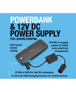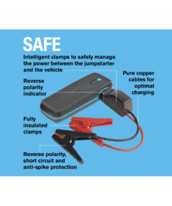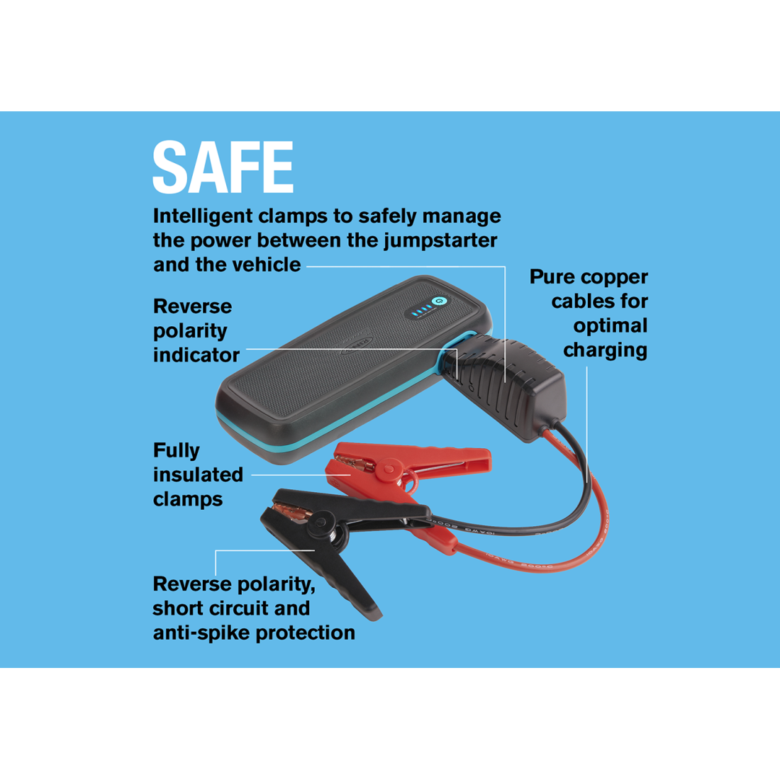 The Ring RPPL400 High Power Jump Starter and Power Bank is a safe and compact lithium jump starter, ideal for vans, SUVs, all car sizes and motorcycles. Able to start 12V vehicles up to 8.0L with petrol engines, and 4.0L with diesel. Its compact design fits easily into a vehicle’s glove box without compromising on power. Also provides power to recharge electronic gadgets including smartphones and tablets.The safe connect system protects the user, vehicle and jump starter when in use. The intelligent clamps safely manage power between the jump starter and vehicle, plus the device features reverse polarity, short circuit and anti-spike protection.Comes with a micro USB for a fast four-hour recharge time. Also includes an LED torch to make jump starting easier and a storage case to keep the product undamaged in the car.