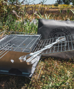 Our Flat Pack Deluxe includes 4 wall panels (1.2mm 3CR12), the baseplate (1.5mm 3CR12), double grid, ribstand, our three-in-one pan/stand/lid, a smoker grid, tongs and a ripstop bag.