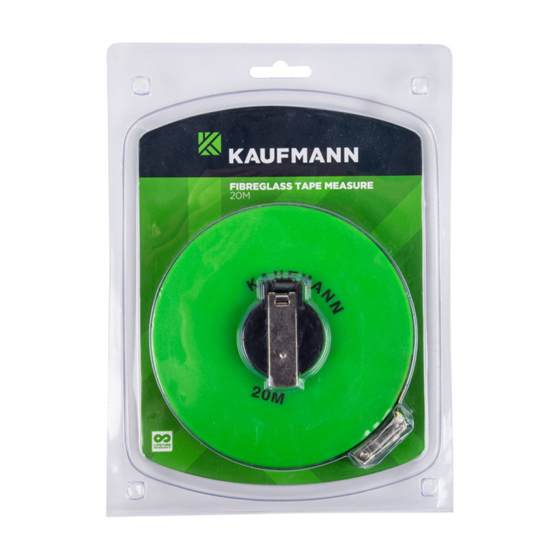 The Kaufmann Fibreglass Tape Measure is an essential tool for professionals and DIY enthusiasts alike. With a generous length of 20 metres, this tape measure is specifically designed for measuring extra-long distances required on building sites.** Key Features:** Durable Construction: Made from fibreglass, this tape measure offers flexibility and resistance to wear, ensuring long-lasting performance.* Plastic ABS Casing: The sturdy casing protects the tape from damage while providing a secure grip during use.* Wind-Up Reel: Features a convenient wind-up mechanism for easy storage and retraction of the tape.* Clear Markings: Double-sided markings in millimetres ensure measurements are easy to read from any angle, enhancing usability on site.* Precision Measurement: Ideal for construction and renovation projects, ensuring accurate lengths are recorded.* User-Friendly Design: Lightweight and portable, this tape measure can be easily carried and used in various environments.* Versatile Application: Perfect for builders, carpenters, and anyone needing to measure large distances with confidence.** With its combination of flexibility, durability, and clear markings, the Kaufmann Fibreglass Tape Measure is a reliable choice for all measuring needs, ensuring accuracy and efficiency on every job.