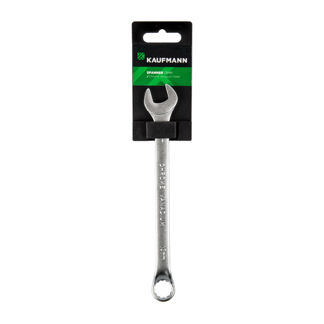 The Kaufmann Spanner R/O Deep Offset 13mm is an essential tool for any workshop or home mechanic. Designed specifically for the effective fastening and loosening of deep-inset nuts or bolts, this combination spanner offers both a flat and an offset ring for versatility in tight spaces.** Key Features:** Material Quality: Constructed from chrome vanadium steel, known for its strength and resistance to wear.* Compliance Standards: Meets the stringent DIN 3113 and SABS 112-1976 specifications, ensuring high performance and reliability. *Design: The combination of flat and offset ring designs allows for greater access and torque in hard-to-reach areas.* Versatility: Suitable for various applications, from automotive repairs to general maintenance tasks.** Whether for professional mechanics or DIY enthusiasts, the Kaufmann Spanner R/O Deep Offset 13mm is a reliable choice for effective toolkits. Its thoughtful design and robust construction make it a valuable addition for anyone needing precision and power in their fastening tasks.