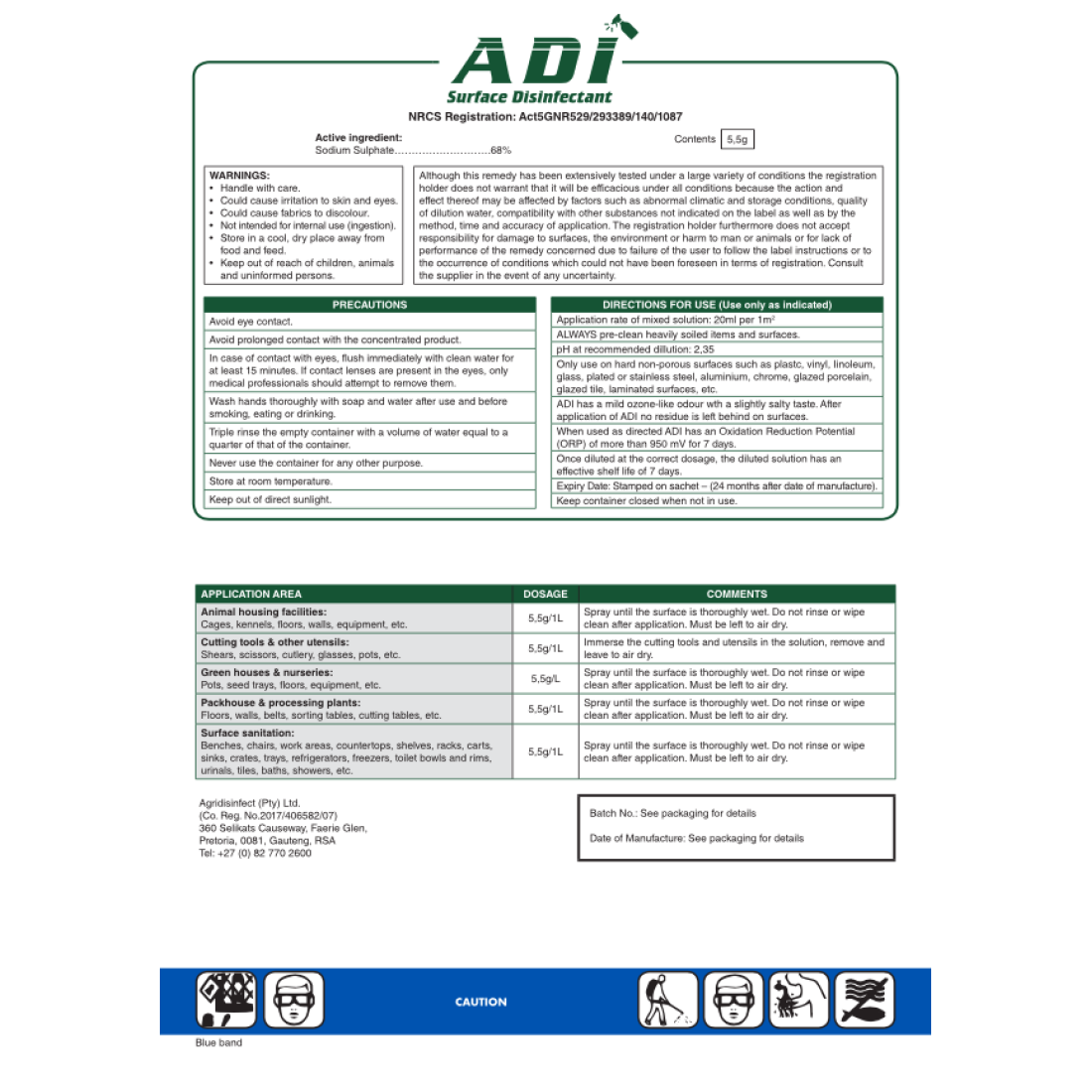 ADI is supplied in a powder and once dissolved in water as indicated on the various packaging sizes, becomes a versatile disinfectant which can be sprayed or fogged in a cost effective manner.