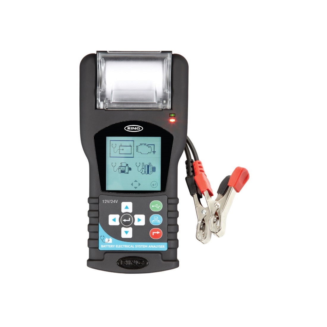 The RBAG750 Graphical Battery Analyser can provide a complete health check of the battery and electrical systems of a 12V and 24V vehicle, be it a motorcycle, car or truck. This multi-function unit can test and analyse the battery, alternator, starter and vehicle earth via its intuitive graphical interface. Results can be printed using the built-in thermal printer or downloaded to a computer through a USB.