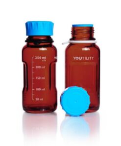 The DWK Duran YOUTILITY Bottle 250 ml is a high-quality laboratory bottle designed for secure storage and precise dispensing of liquids. Made from amber glass, it protects light-sensitive substances from UV exposure. The graduated scale allows for accurate measurements, and the GL 45 neck ensures compatibility with standard laboratory equipment. This bottle also features a screw-cap with a polypropylene (PP) pouring ring for easy dispensing and a secure seal. The bottle is sold in a convenient pack of 4, making it an ideal choice for labs requiring multiple storage and dispensing options.