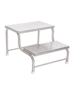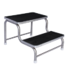 Stationary double step with aluminium ‘chequered sheet top with stainless steel surrounds. Epoxy powder coated tubular frame mounted on 4 rubber feet. (Dimensions; width 310mm; length 515mm; height 150mm)