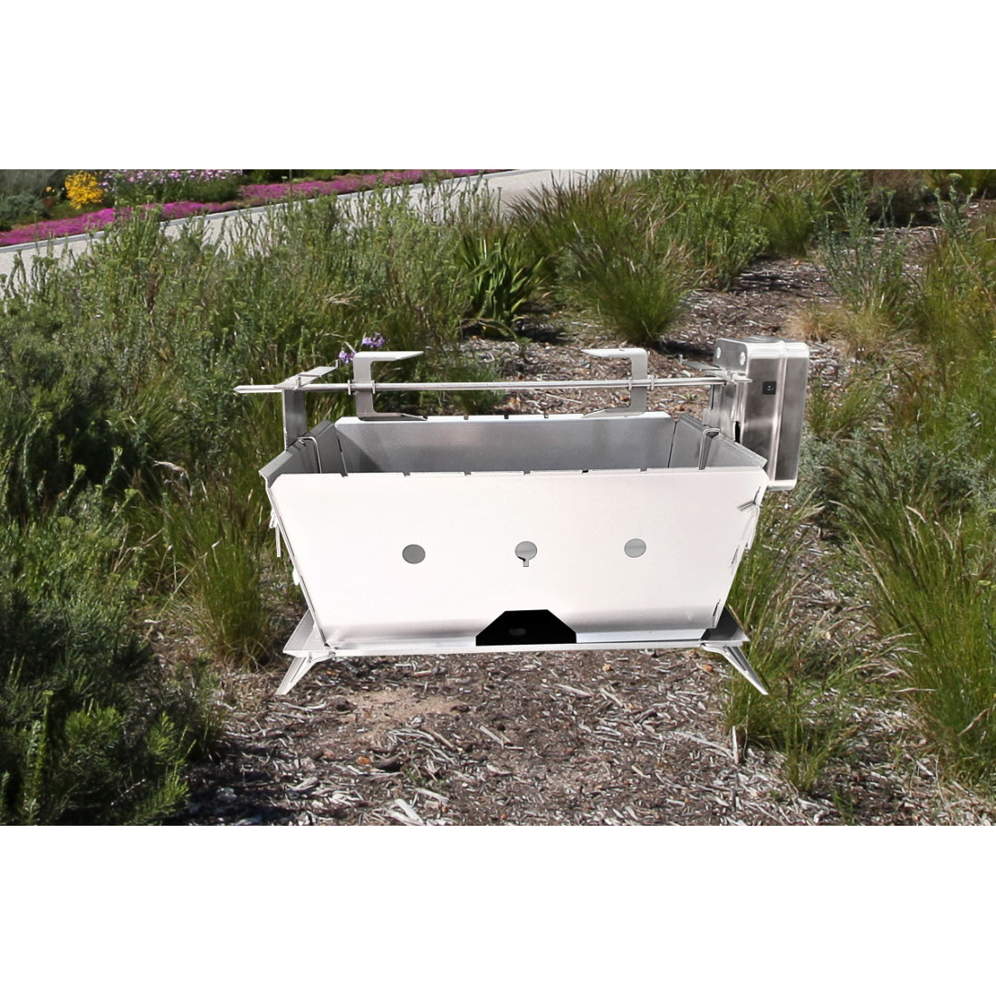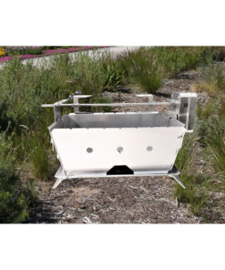 The Flat Pack Deluxe Long Rotisserie Add-On is a versatile accessory designed to fit on the Flat pack deluxe long.