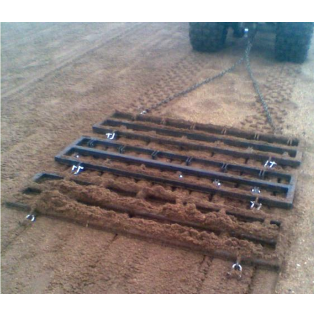 Primarily the Drag Harrow is used to break up the sand in order to achieve a consistent sand quality thus preventing injury to the horseâs legs and tendons. By selecting the correct tine type and position, one can ensure that the sand is thoroughly broken up without damaging the substrate base or membrane of the arena. A neat surface can also be produced by bolting the correct tines in the final frame.