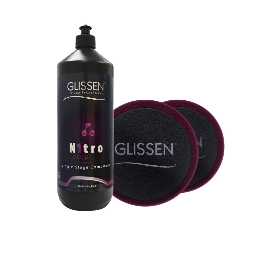 Achieve surpassing results with the dynamic Glissen N1tro compounding combination.The First Class Glissen N1tro Single Stage compound permanently removes sanding marks, swirl marks and enhances gloss. It quickly and effortlessly removes p1500 sanding marks and finer scratches on freshly painted and fully cured 2k, MS, HS, UHS or scratch resistant paint, achieving a superior mirror finish and is easy to clean & wipe.Used in conjunction with the advanced Glissen N1tro 6â Purple Compounding Foam Applicators which are designed to achieve faster cutting action with extended longevity and durability.
