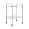 Epoxy coated frame and s/s shelves. Epoxy powder coated tubular frame. Grade 18/12 stainless steel shelves 0,9mm thick. 4 x 50mm swivel castors. (Dimensions; width 457mm; length 609 mm; height 855mm)