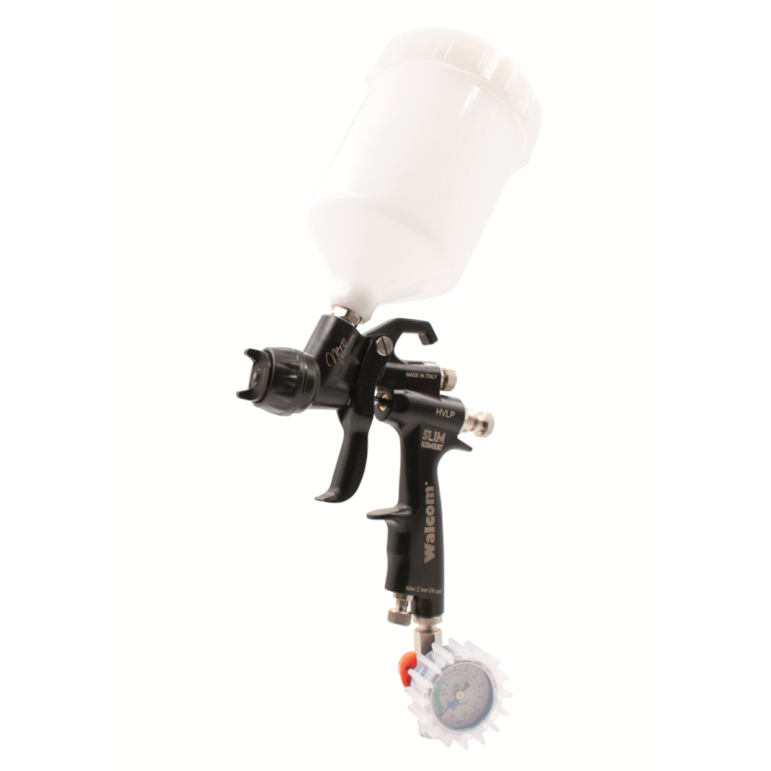 The Walcom SLIM KOMBAT is a unique and revolutionary version of the SLIM spray gun, combining quality, reliability and versatility.SLIM KOMBAT is incredibly light, weighing 380g making it a light and easy gun to use. It breaks the rules, abandons the classic aluminium body and presents itself with an innovative magnesium body, injected with Kevlar fiber. The air consumption (220-260 l/min) and high transfer efficiency (over 80% for primers and 70% for bases and clear) delivers outstanding atomisation quality.Manufactured from materials like Kevlar Fiber and Magnesium that is 5 x stronger than steel and highly solvent resistant. Save on product and time as the high transfer efficiency ensures optimised atomisation and guarantees precision. It is also fully adjustable, allowing for complete control over the product distribution.