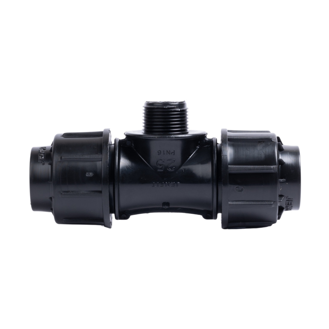 Tee Compression Male 25×1. Compression fittings for HD polyethylene pipe. Outer dimensions comply with ISO standards from 16mm to 110mm. Rubber O-ring ensures a perfect seal and complete water tightness whether the pipe is bent or straight. Works well in high-pressure applications with a 16 Bar resistance exceeding all pull-out standards. Features a universal connection on one side compatible with galvanized PVC (imperial and metric) HDPE pipes. Durable and corrosion-resistant these fittings offer reliable long-lasting performance for irrigation and industrial systems.
