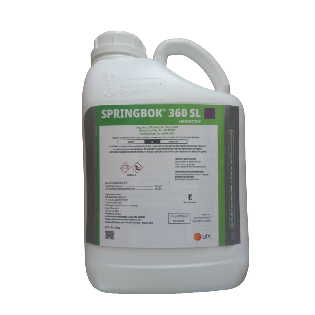 SPRINGBOK 360 SL Reg. No.: L 6719 Act /Wet No. 36 of/van 1947 READ ATTACHED PACKAGED LEAFLET BEFORE USE AND KEEP OUT OF REACH OF CHILDREN AND ANIMALS HRAC HERBICIDE GROUP CODE: 9 HRAC ONKRUIDDODERGROEP KODE: A soluble concentrate non-selective foliar, systemic herbicide for the control of a wide range of annual and perennial grasses, broadleaf weeds and certain woody perennials as listed. Can also be used to control weeds in maize varieties containing the glyphosate resistant gene.