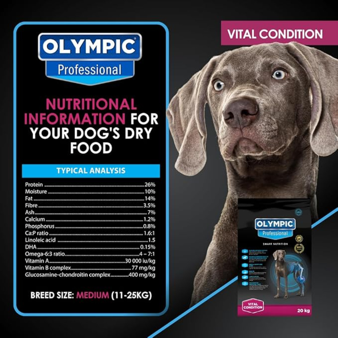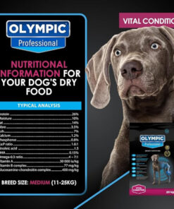 OLYMPIC® PROFESSIONAL VITAL CONDITION is formulated to meet the specific energy needs of active and working dogs of all breed sizes. The conditioning formulation offers special support for dogs with skin and digestive sensitivities, thus providing outstanding skin, coat and digestive health.