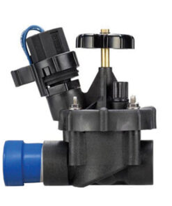 Automatic inline sprinkler control valve with flow control. Both ends BSP- threaded. Durable; non-corrosive plastic construction with replaceable low- voltage solenoid. Internal bleed level for manual on/off operation. Unique balanced diagram design.