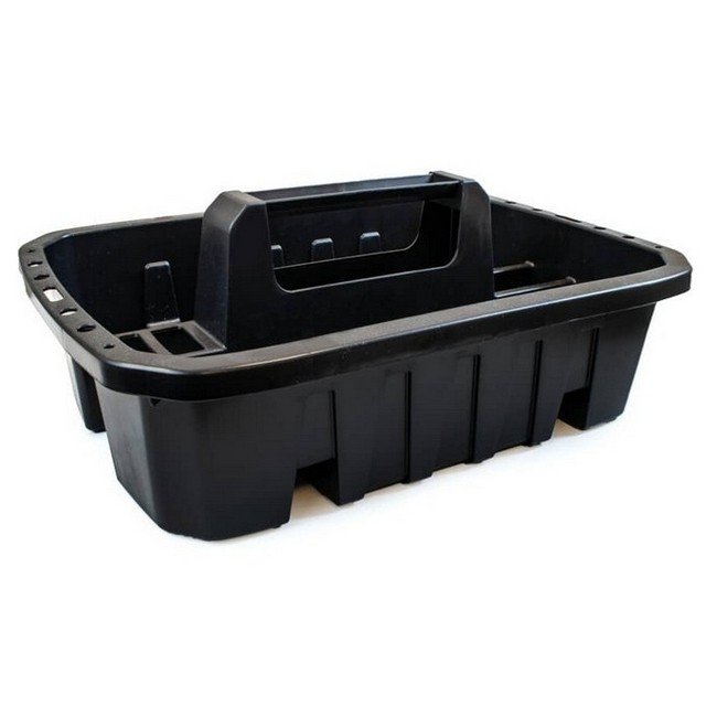 - Compact black tool tote features impact resistant plastic construction for long-lasting durability
