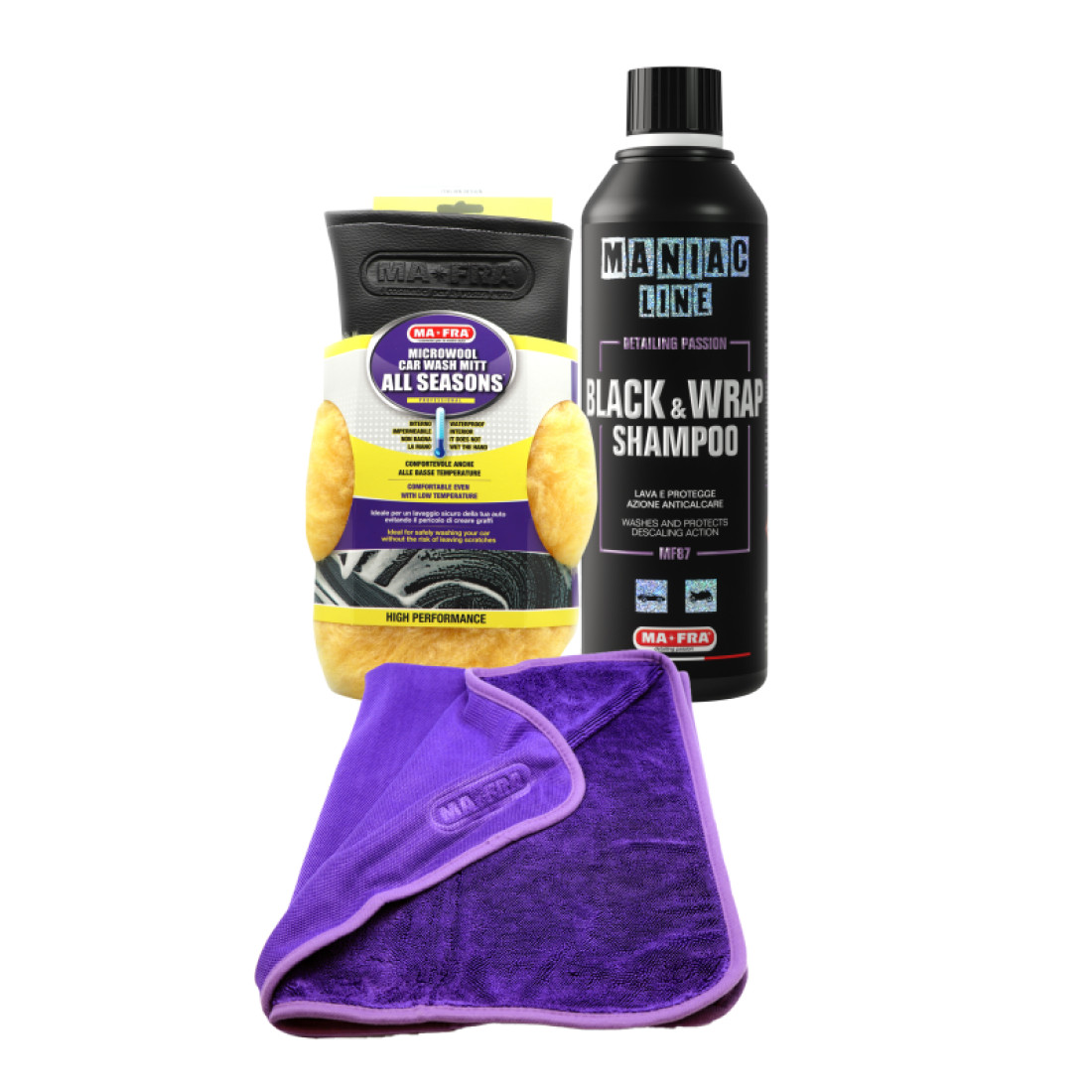 Maniac Line Black & Wrap Shampoo:A 2-in-1 product designed to clean and protect black, film-coated or PPF cars, even with a matte finish. The product, thanks to its formula rich in mineral contents, it drastically prevents the formation of lime-scale stains during the drying phase. This product revitalises the car paint by thoroughly eliminating the most persistent dirt. The high lubricating properties of Black & Wrap Shampoo creates a slippery surface that allows a wash mitt to slide without the risk of creating unwanted micro-scratches.MA-FRA Super Dryer Cloth:A synthetic microfiber cloth devised to help professionals and owners achieve a quick and efficient drying process. A large sized cloth equipped with a high-absorbency capacity that is durable and resistant to wear and tear.Even after repeated washes and drying, the Super Dryer Cloth flawlessly eliminates all residual traces of water from any vehicle without leaving halos.MA-FRA Micro-Wool Car Wash Mitt:A glove featuring a soft wool exterior and waterproof interior.Ideal for safely washing any vehicle without the risk of leaving any scratches. The high performance wash mitt is long lasting and comfortable to wear as the user’s hand does not get wet.
