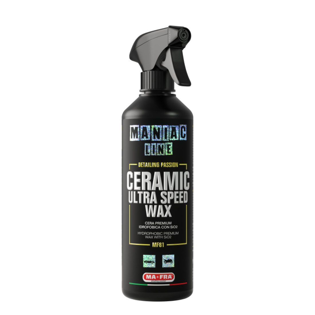 The Maniac Line Ceramic Ultra Speed Wax is a sealing spray wax that contains ceramic polymers. The super-hydrophobic SiO2 that bind to the surface create a self-cleaning protective shield.The product is quick and easy to apply, guaranteeing a high gloss and a deeper, fuller colour with a wet effect. It can be applied on any surface creating a protective barrier that allows excellent resistance to washing.This superior Ceramic Ultra Speed Wax can last up to 4 months, depending on environmental factors.DILUTION:Recommended to use undiluted.