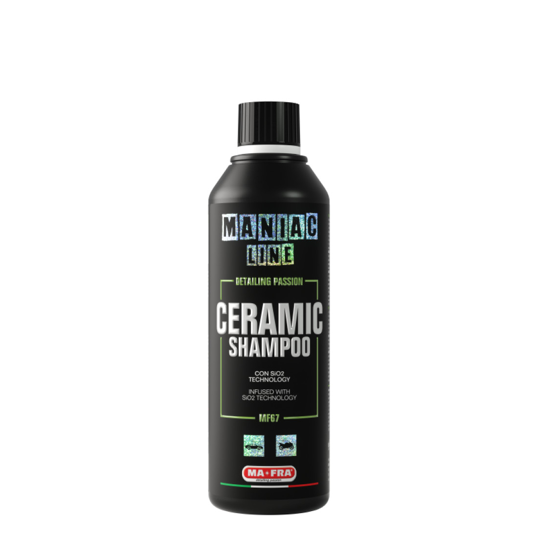 The Maniac Line Ceramic Shampoo washes, seals and protects. Thanks to its 3-in-1 formula and the presence of super hydrophobic Si02 ceramic polymers it gives the treated surface a self-cleaning hydrophobic capacity that allows you to keep the car cleaner for longer.This superior product can be used as a maintenance product, increasing and enhancing the properties of the wax, sealant and ceramic coating previously applied to the surface.Dilution: For a pre-wash used in a foam gun dilute 1:3.For hand wash with a bucket of water dilute 1:5.