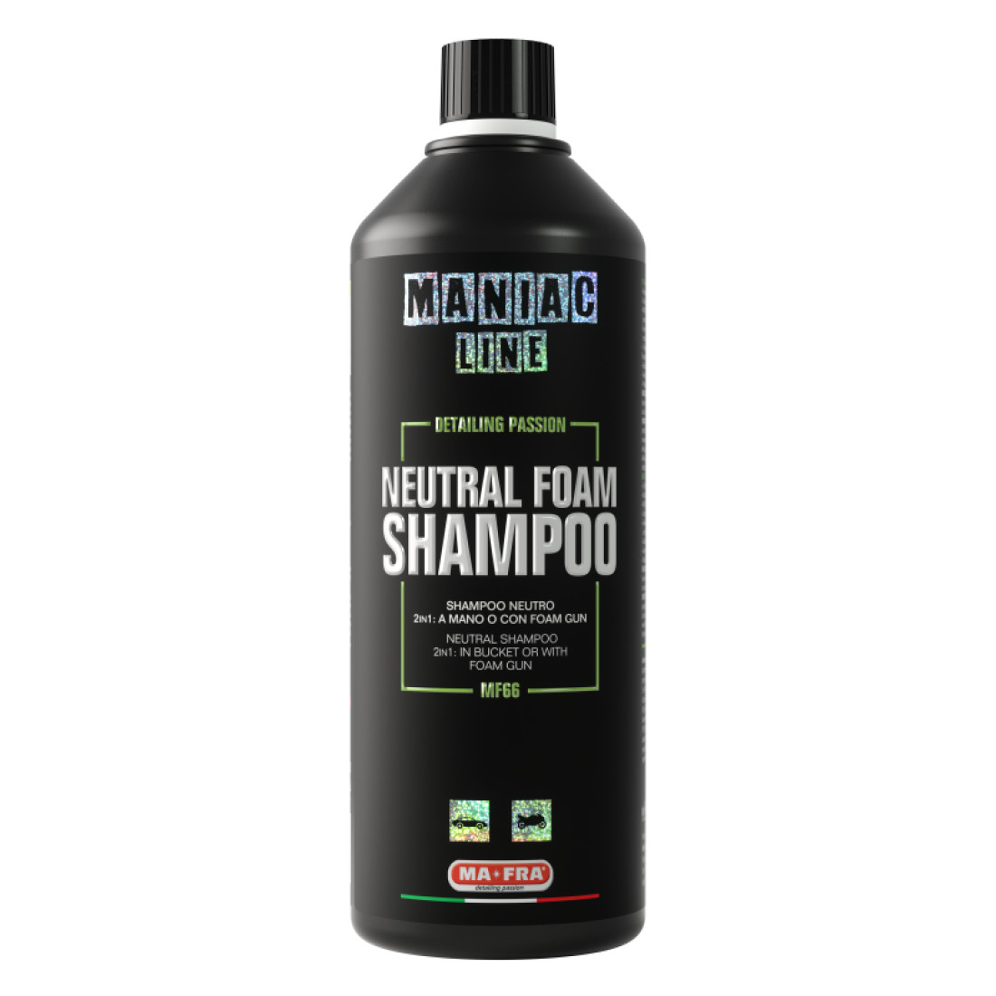 The Maniac Line Neutral Foam Shampoo is a 2-in-1 formula car shampoo with a neutral pH, ideal for frequent car washes. The product effectively softens build-up and exhibits excellent economy thanks to high dilution ratios up to 1: 400.The lubricating foam produced by Neutral Shampoo encapsulates the dirt facilitating removal during the subsequent rinsing phase without creating halos, streaks and without the risk of creating swirls or micro-scratches.Dilution:For a pre-wash used in a foam gun dilute 1:10.For hand wash with a bucket of water dilute 1:400.