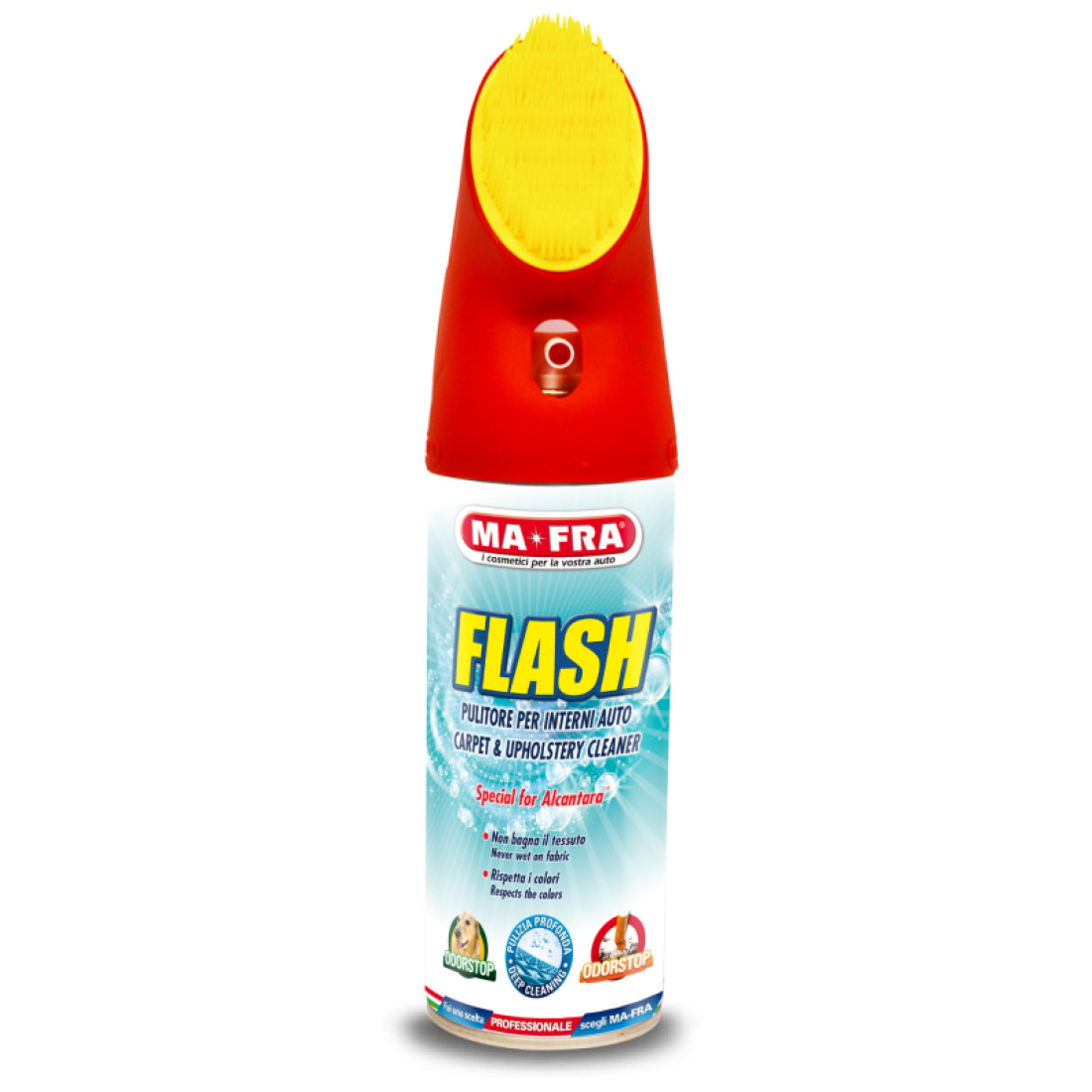 MA-FRA FLASH is an exceptional product, used by professionals for its dry, intensive cleaning and high performance foam. Its active foam facilitates the removal of dirt from fibres without wetting the fabric.The carefully selected active ingredients is colour safe and enables fast and efficient removal of the most stubborn dirt on any type of covering: fabric, leather, velvet and Alcantara on seats, mats and finishes. Its innovative formula effectively neutralises bad odours caused by animals, food and tobacco.The super cleaning action of FLASH is further enhanced by the integrated ergonomic brush that allows for removal of any kind of stains as well as an extremely effective and deep cleaning effect.