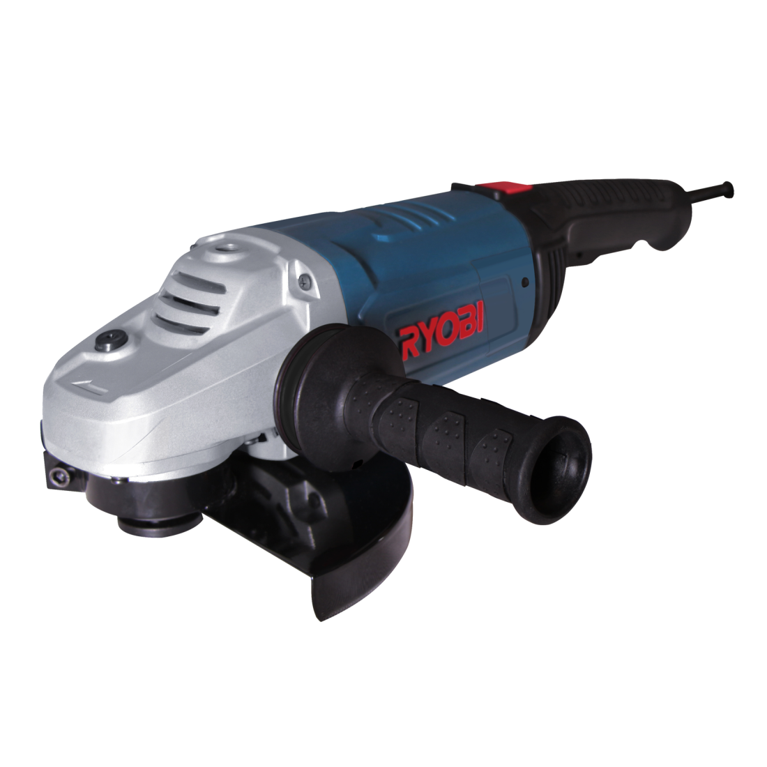 The grinder uses a powerful motor and a large wheel for heavy grinding work. It has a spindle lock for quick disc changes and a rear trigger with a lock on function for safer use. The rear handle rotates, and the side handle adjusts to three positions for better control and comfort.