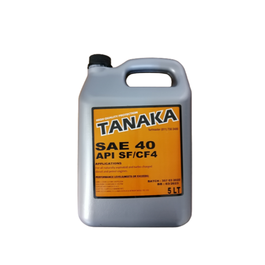 SAE 40 Tanaka Engine Oil â 5 liter P/n: PPO-SAE40-5LTXDescription: Oil -SAE40Size: 5 LiterFor: Honda Briggs Kohler Robin Kawasaki Torx Hoffman Magnum Talon Yamaha Yanmar Rato Loncin Turner Morris engines.Tanaka Motor Oils are a specialist range of high quality, low detergent/dispersant monograde lubricants. These oils are suitable for use in naturally aspirated four stroke petrol and diesel engines and classic gearbox designs.In this SAE stands for Society of automotive engineers. and 40 refers to the viscosity of oil (thickness of oil) Higher the viscosity , lesser the flow of oil.They are manufactured from high quality base oils and carefully selected additives which impart enhanced resistance to oxidation and bearing corrosion protection.Excellent deposit controlGood protection against sludge formation and varnish resistantExcellent Anti-wear and corrosion protectionOxidisation stabilityDispersal and detergent propertiesWide temperature rangeHigh viscosity index promotes high oil pressure
